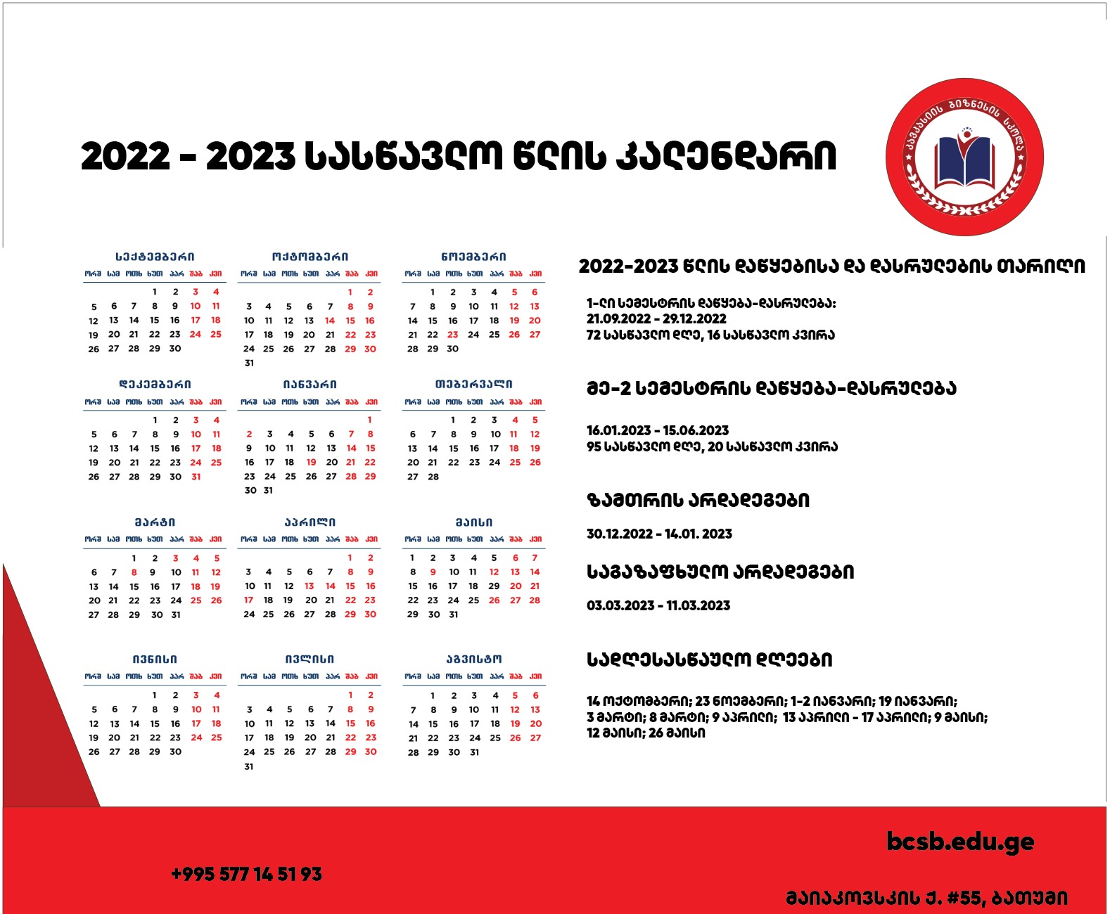 კავკასიის ბიზნეს სკოლის 2022-2023 სასწავლო წლის კალენდარი